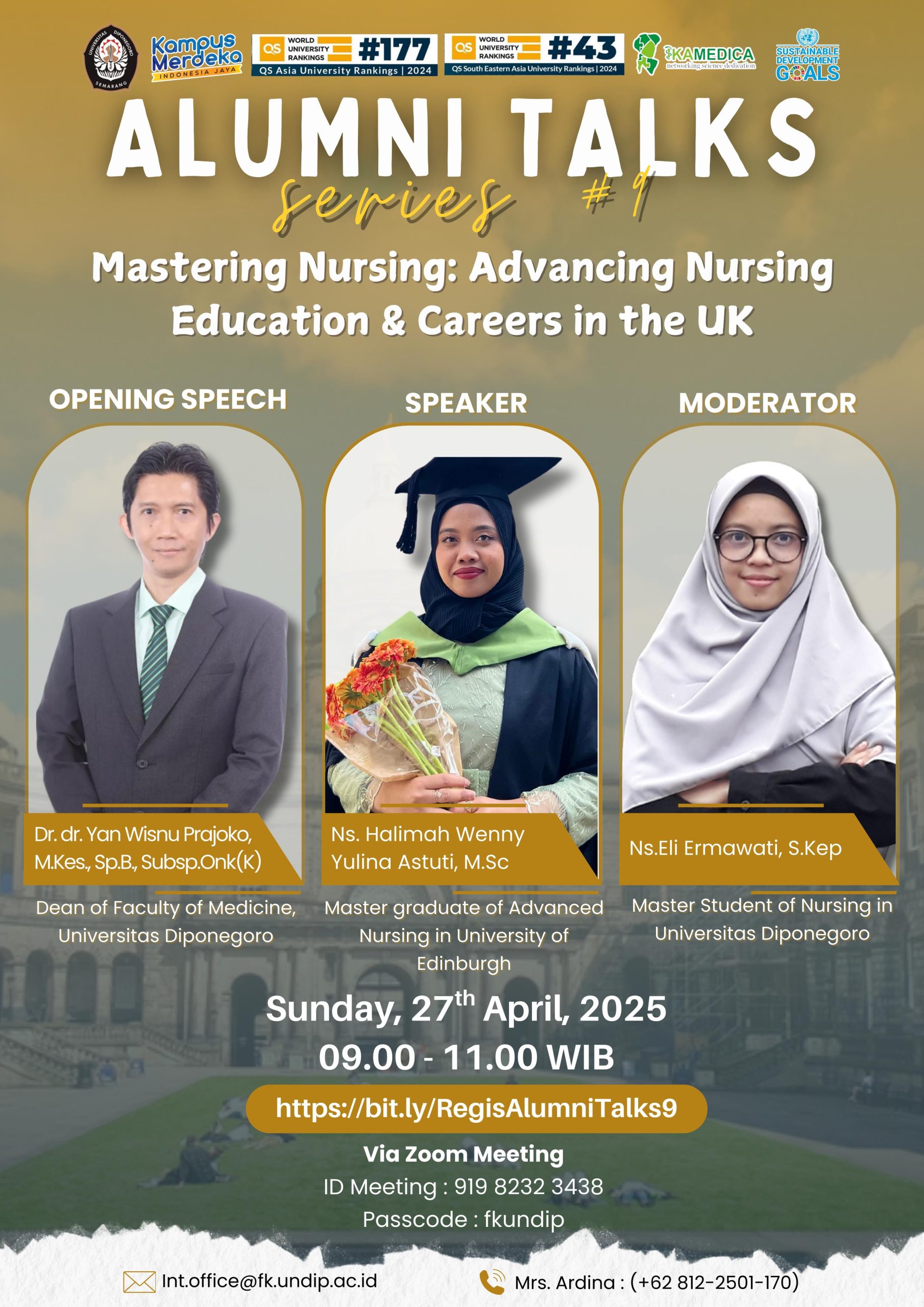 Semarang – Kantor Reputasi, Kemitraan, dan Konektivitas Global Fakultas Kedokteran Universitas Diponegoro kembali menyelenggarakan Alumni Talks Series 9 dengan tema “Mastering Nursing: Advancing Nursing Education & Careers in the UK” pada Sabtu, 26 April 2025 pukul 09.00 WIB secara daring melalui Zoom Meeting.