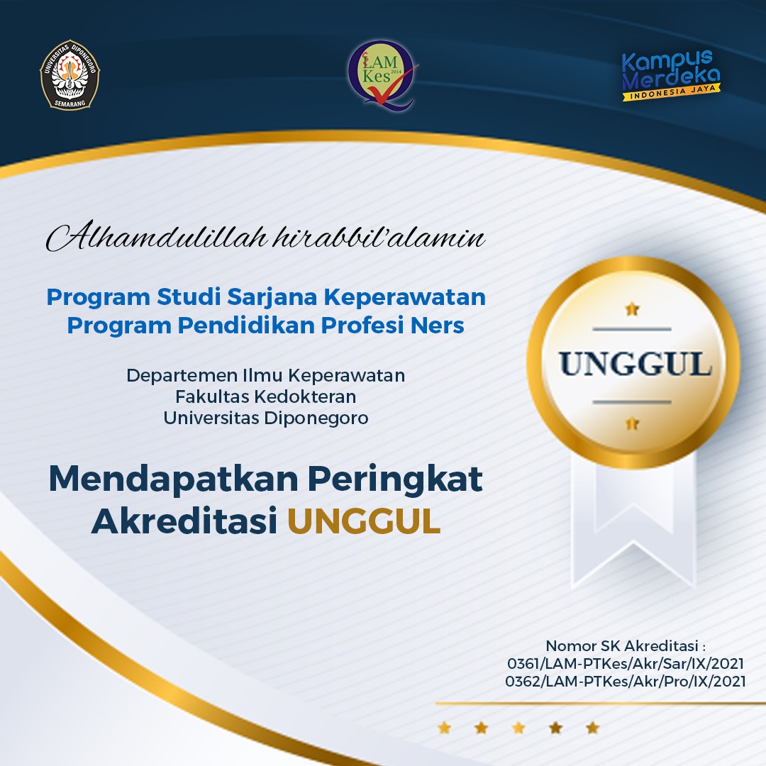 Selamat dan sukses untuk civitas akademika Program Studi Sarjana Keperawatan dan Prodi Profesi Ners Departemen Ilmu Keperawatan Fakultas Kedokteran Undip atas pencapaian ini. [Nr]